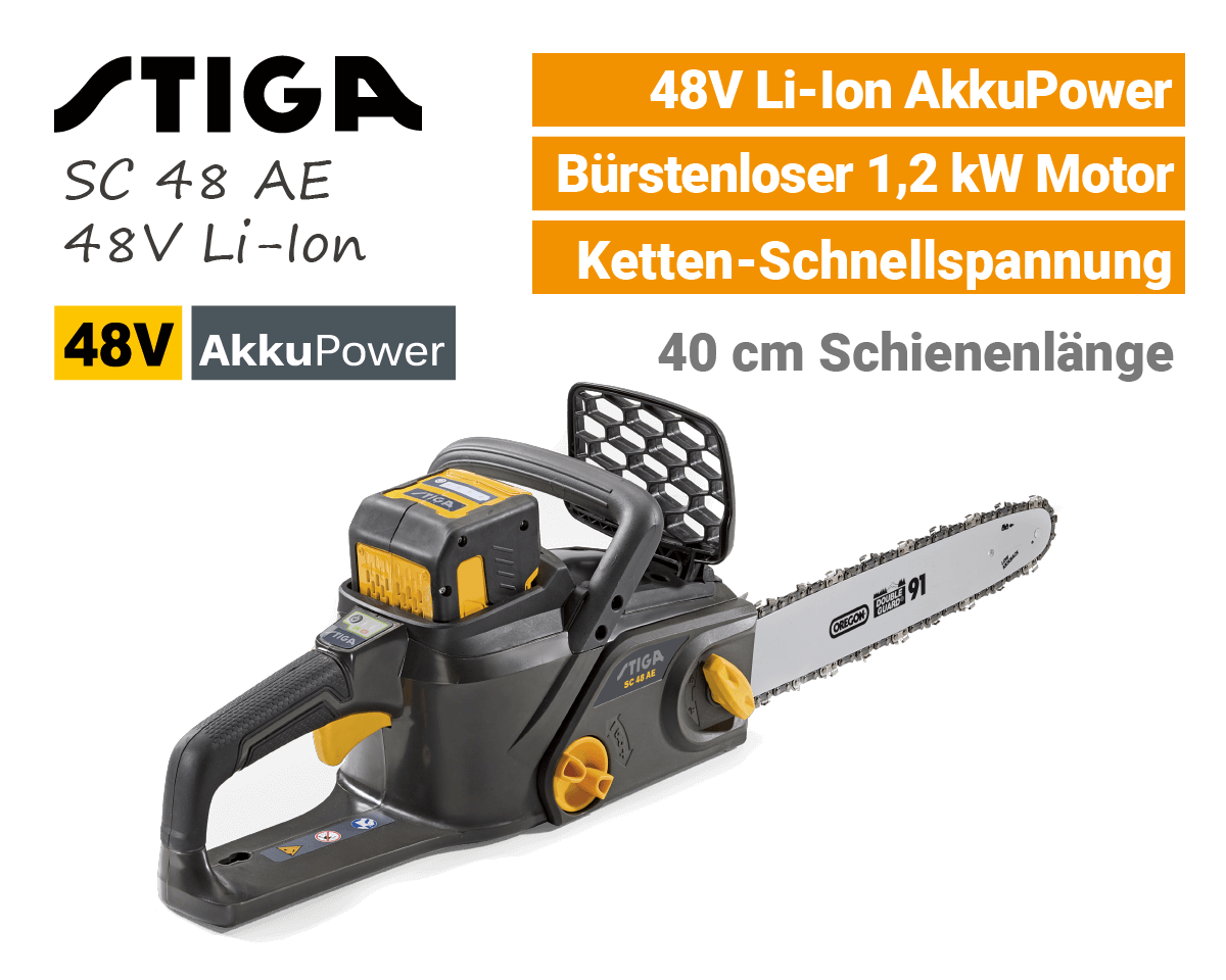 Stiga 48V Li-Ion Akku-Kettensäge, Akku-Baumsäge, Akku-Heckenschneider | 48V AkkuPower