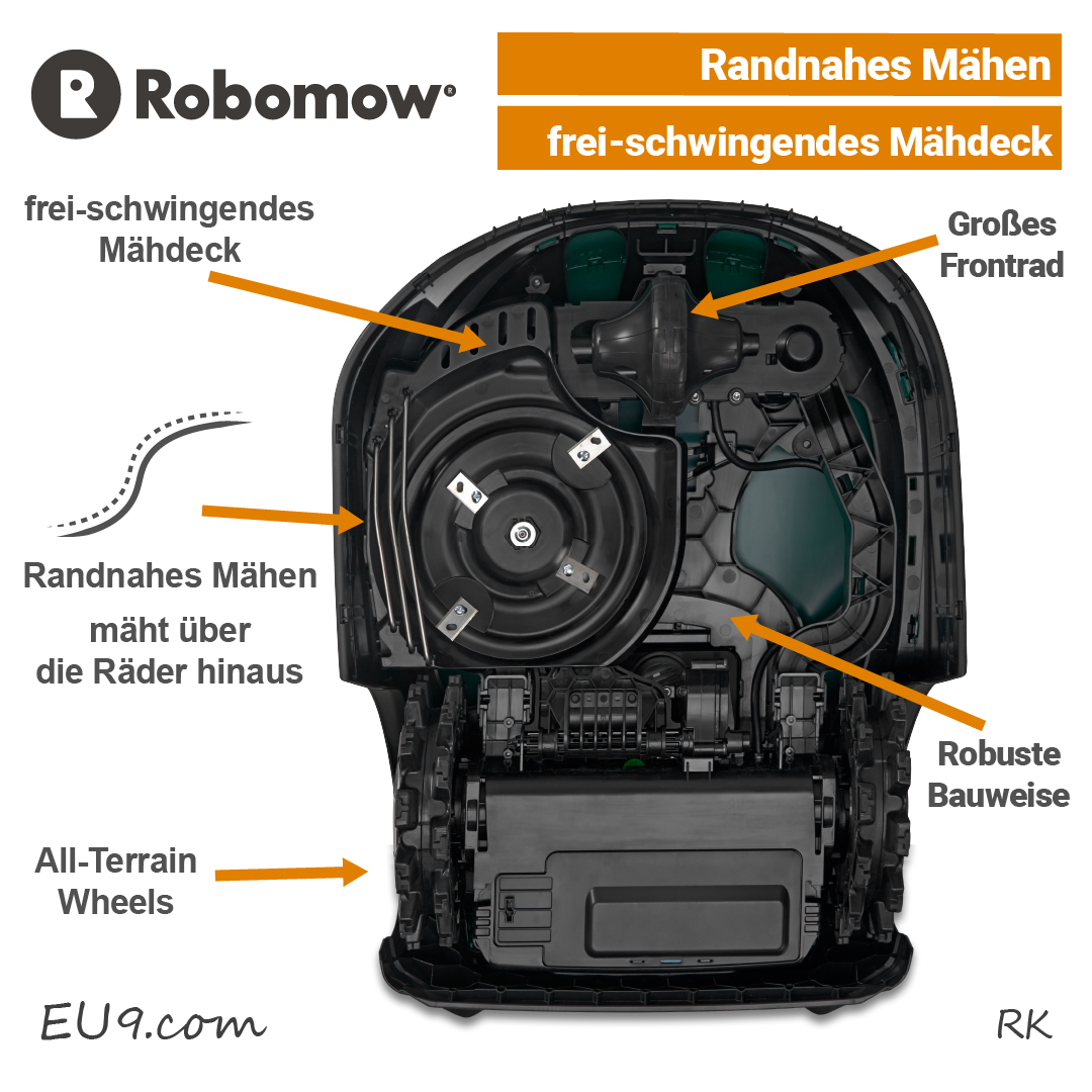 Der Robomow RK 1000 überzeugt mit vielen interessanten Produktvorteilen. Ob Robomow APP 3.0, besonders nahes mähen der Rasenränder, frei-schwingenden Mähwerk oder leise Motoren, der RK1000 zeigt in allen Bereichen Stärke.