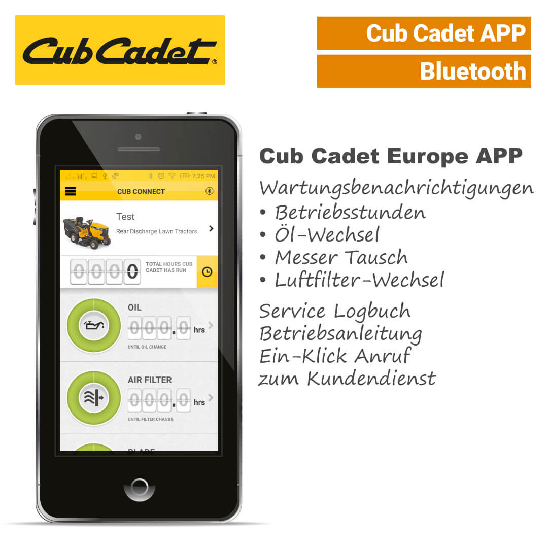 Der Betriebsstundenzähler hat ein Anzeigedisplay am Instrumenten-Pult und liefert zusätzlich per Bluetooth die Daten zur Cub Cadet XT APP.