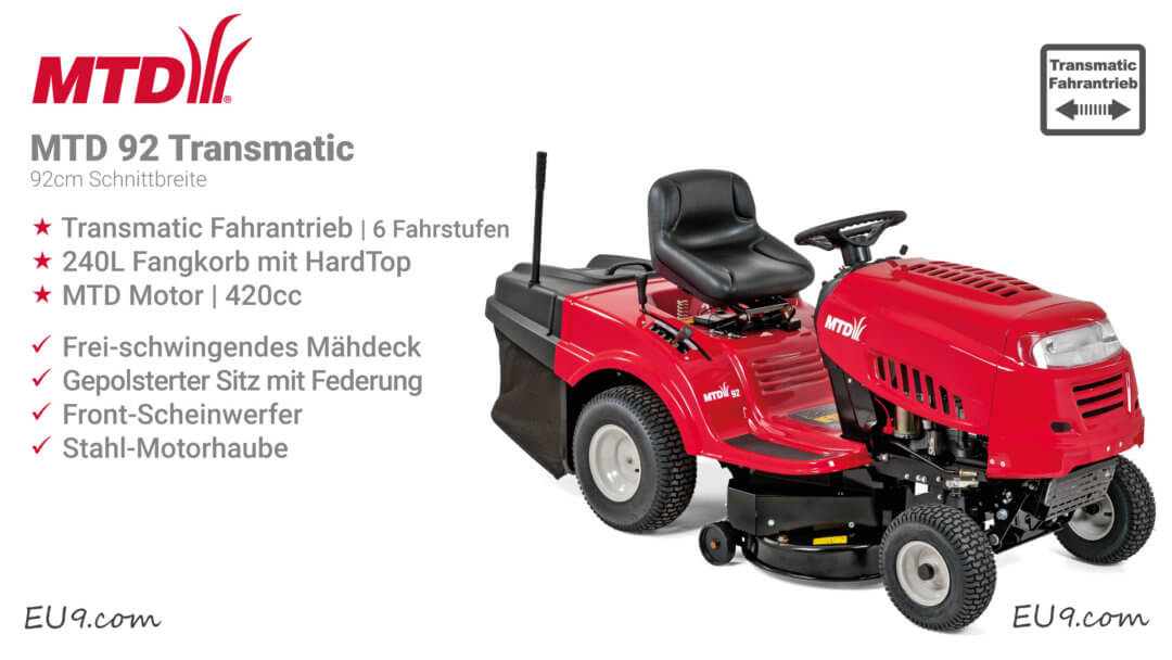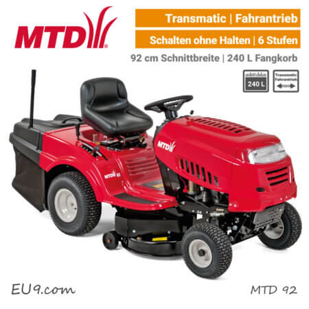 Der MTD 92 Rasentraktor ist ein kleiner All-Round Traktor mit moderner Transmatik Fahrsteuerung. Einfach während der Fahrt schalten ohne zu Halten. Darüber hinaus benötigt der Fahrantrieb keine Kupplung und bietet noch mehr Komfort beim Rasenmähen.